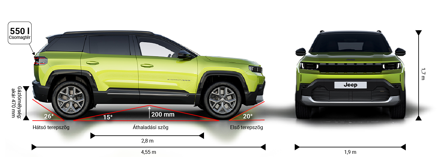 Az új Compass tágas, mégis városbarát arányokkal érkezik: 4,55 m hossz, 1,9 m szélesség, 1,7 m magasság, 2,8 m tengelytáv, 550 liter csomagtér.